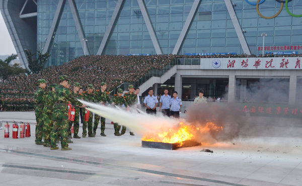 又讯 9月23日,明志书院举行2015级新生安全教育报告会,潍坊市地震局、潍坊市消防支队的专家为近500名新生讲解了防震和消防常识。报告会后,在明志书院体育场进行了灭火实战教学演习。