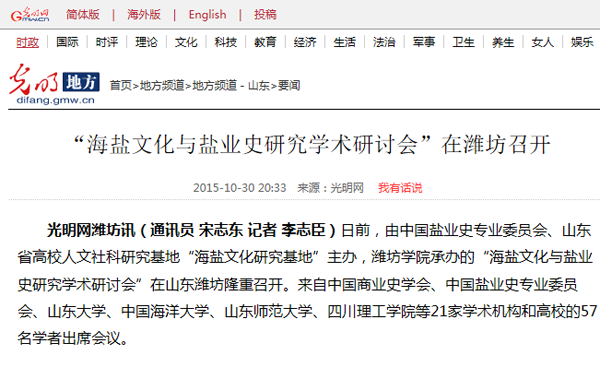 本站讯 10月30日,《光明网》刊载了“海盐文化与盐业史研究学术研讨会”在潍坊召开的新闻。