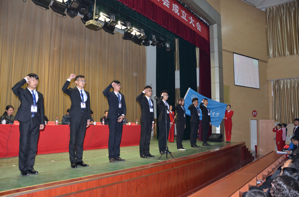 大会上,新老校学生会主席团进行了会旗交接仪式。在场的第十五届学生会所有成员在学生会主席的带领下进行宣誓。