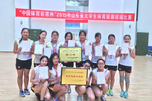 本站讯 “中国体育彩票杯”2015年山东省大学生体育联赛排球比赛11月25日-28日在潍坊举行。我校女子排球队获得女子甲组第二名,并获得“体育道德风尚奖”。本次比赛是由山东省财政厅、教育厅、体育局共同主办,全省高校共有21支代表队参加角逐。