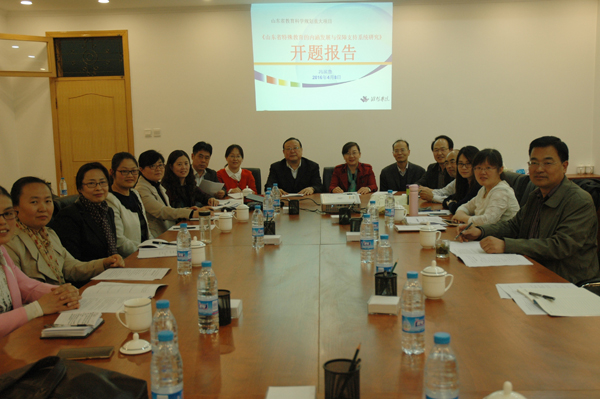 本网讯 4月8日,山东省教育科学“十二五”规划2015年度重大招标课题“山东省特殊教育的内涵发展与保障支持系统研究”(立项号:VZ15008)开题论证会在我校主校区顺利召开。本项重大招标课题首席专家冯滨鲁教授出席论证会,并向与会专家介绍了课题的申报经历、开题准备情况及下步课题研究计划。省教育科学规划办的张玲玲博士、潍坊盲校孟祥波校长、曲振国教授,以及课题组全体成员、教务处等相关部门的有关人员参加开题论证会。特教幼教师范学院院长李健教授主持了开题论证会。