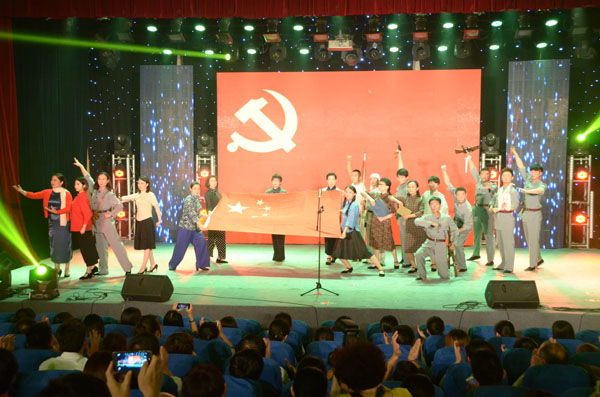 庆祝大会之后,纪念建党95周年“高举旗帜 同心筑梦”文艺晚会在开场舞《走向复兴》中拉开帷幕。教职工舞蹈协会、飞扬话剧团共同创作的情景剧《为了那面旗帜》、老教师合唱队的小合唱《好人就在身边》,给观众留下了深刻印象;男声独唱《咱们的老百姓》、舞蹈《红旗颂》将演出现场气氛推向高潮;歌伴舞《共筑中国梦》通过演员们优美的歌声和舞蹈,歌颂伟大祖国繁荣昌盛,赞美人民和谐幸福美好的生活。精彩的文艺演出,赢得观众阵阵掌声,晚会在大合唱《没有共产党就没有新中国》的雄壮歌声中圆满结束。
