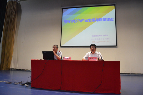 本网讯 8月29日,我校举行理论学习报告会,邀请原北京师范大学校长、现任中国教育学会会长钟秉林教授来校作高等教育内涵发展与质量建设学术报告。党委书记孙文亮主持报告会,学校领导冯滨鲁、王清明、丁子信、马茜华、朱猷武、赵光强、王旭升,正高职称人员、全体处级干部、正科级干部参加了报告会。