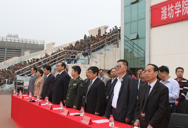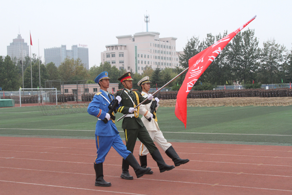 本网讯 10月21日,我校2016级新生军训汇报表演暨总结大会举行。学校领导孙文亮、冯滨鲁、王清明、丁子信、马茜华、赵光强、王旭升以及潍坊军分区、潍坊市高新区武装部领导,学校各单位各部门主要负责同志观看了军训汇报表演。大会由副校长丁子信主持。