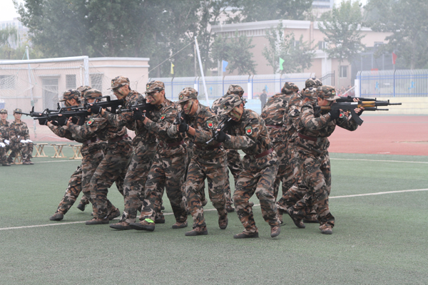 升国旗仪式后,2016级新生军训方队依次迈着整齐的步伐通过主席台。之后,他们进行了分列式、军体拳、内务整理、正规化动作、单兵战术动作演练及战场救护等表演。