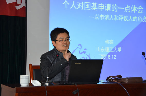 本网讯 12月22日, 学校举行国家自然科学基金项目申报专家报告会,积极为申报2017年国家自然科学基金项目作准备。山东理工大学副教授、硕士生导师韩鑫博士受邀作了专题报告。副校长赵光强出席报告会。科研处负责同志主持报告会。