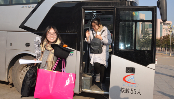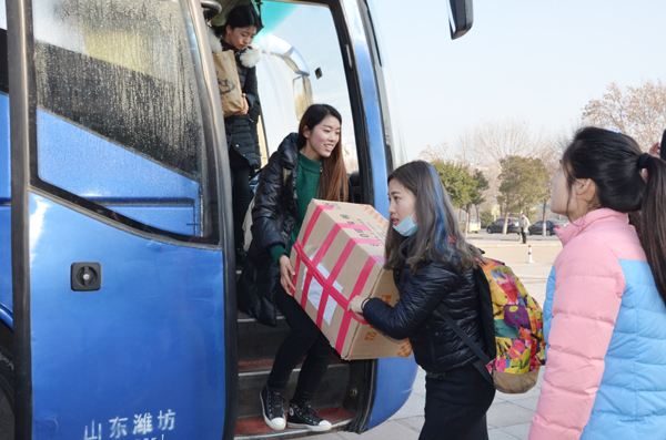 本网讯 1月6日,学校行政楼后广场一派喜气洋洋热闹温馨气氛。我校分赴安丘市和临朐县参加实习支教的489名学生,圆满完成实习支教任务,顺利返校了。