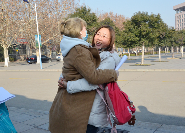为了迎接实习支教学生返校,教务处、文学院、外国语学院、数学院、体育学院、教师教育学院负责同志、相关负责同志以及辅导员老师们,早早就在办公楼后广场翘首等待着学生们返校的客车。大巴车刚一停稳,学生就从车上跳下来,同久别的游子一般,扑在老师的怀里,与四个月没见的老师紧紧拥抱在一起。