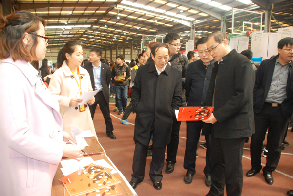 本网讯 3月26日,山东省2017年春季高校毕业生服务“蓝黄”两区潍坊学院专场招聘会举行。副校长丁子信、市人社局相关负责同志到招聘现场检查、指导工作,不时与招聘单位工作人员和求职者交谈,了解企业用工需求以及求职情况。