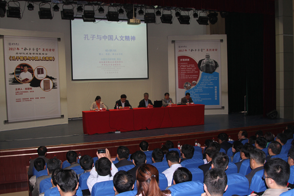 本网讯 为深入贯彻落实党中央关于培育和践行社会主义核心价值观的意见要求和习近平总书记关于弘扬中华优秀传统文化系列重要讲话精神,4月24日,潍坊学院2017年“孔子学堂”系列活动启动仪式暨首场报告会举行,校领导孙文亮、冯滨鲁、丁子信、马茜华、赵光强、王旭升出席启动仪式。启动仪式由副校长王清明主持。中国孔子研究院院长、研究员、博士生导师杨朝明应邀出席并作题为《孔子儒学与中国人文精神》的学术报告。