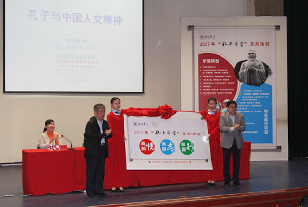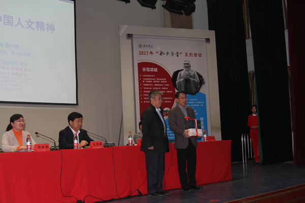 党委书记孙文亮和杨朝明共同为潍坊学院2017年“孔子学堂”活动项目揭牌,杨朝明为我校 “孔子学堂”捐赠了书籍。