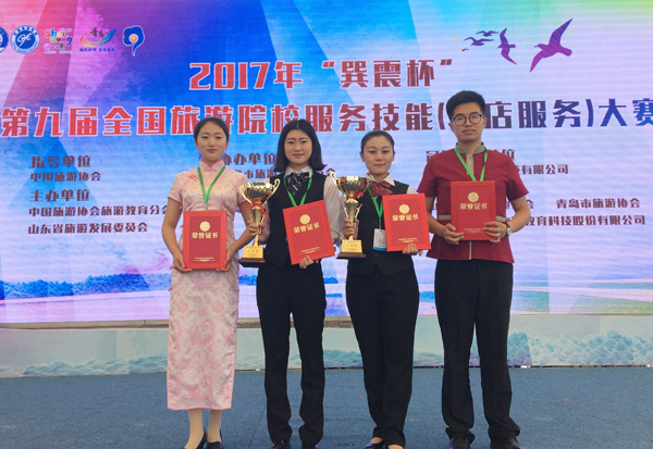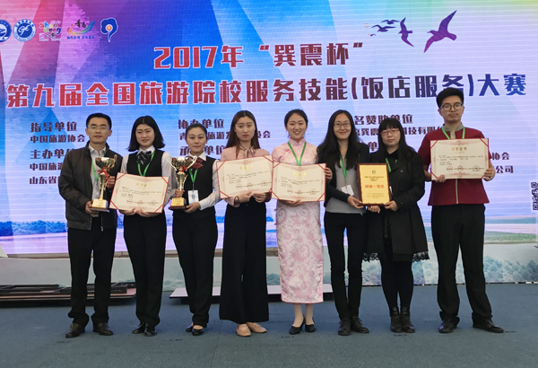 本网讯 5月6日至9日,由中国旅游协会旅游教育分会和山东省旅游发展委员会联合主办的“巽震杯”第九届全国旅游院校服务技能(饭店服务)大赛在青岛举行。大赛由青岛酒店管理技术职业学院承办,共有来自全国各地的200多所本专科院校和中等职业院校的800名选手、2500名指导教师和领队参加或观摩比赛。经过激烈角逐,我校历史文化与旅游学院代表队最终获得一等奖两项、二等奖一项、三等奖一项和团体一等奖的历届最好成绩。