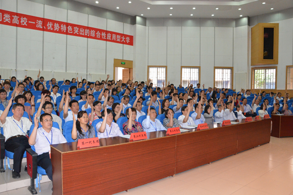 会议号召,全校上下要在学校党委的正确领导下,高举中国特色社会主义伟大旗帜,坚持立德树人根本任务,深入实施“四大战略”,勇于担当“六大任务”,团结一心、凝心聚力,为早日建成省内同类高校一流、优势特色突出的综合类应用型大学而努力奋斗。