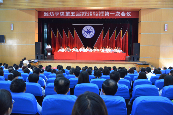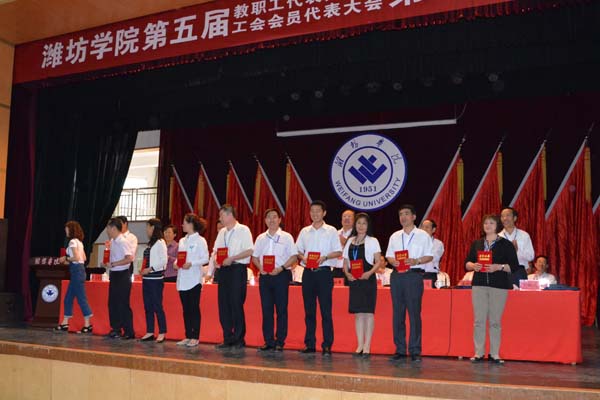 郭召义代表市总工会祝贺大会的召开。他指出,学校工会紧紧围绕学校中心工作,团结带领广大教职工崇尚师德,教书育人,推动了学校教学与管理各项工作的创新发展。同时,积极维护教职工合法权益,参与潍坊工运事业建设发展,在推动驻潍高校工会工作创新发展中发挥了重要作用。他希望学校工会工作进一步提高推进学校民主政治建设重要性的认识,加强各项工会制度建设,深入落实依法治会、依法治校要求,充分发挥工会组织优势,推动学校更好更快发展。