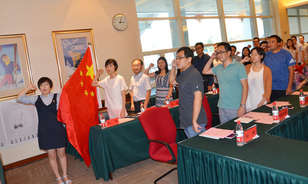 在省高校青年教师教学竞赛一等奖获得者刘莉的带领下,近一年内到校工作的新教师面向国旗,庄严地发出了爱岗敬业、为人师表的铮铮誓言。