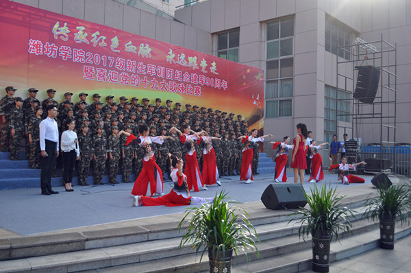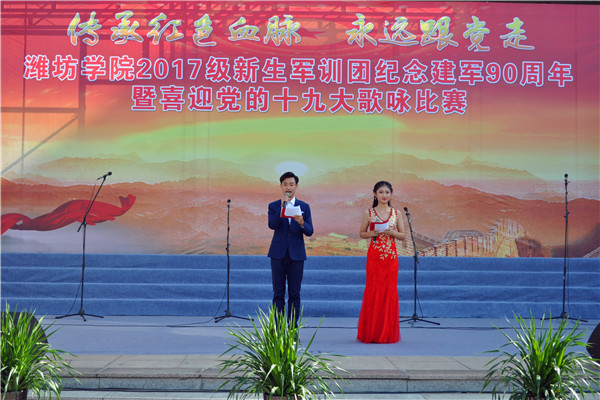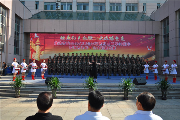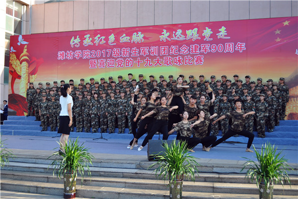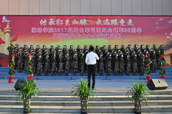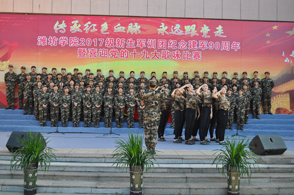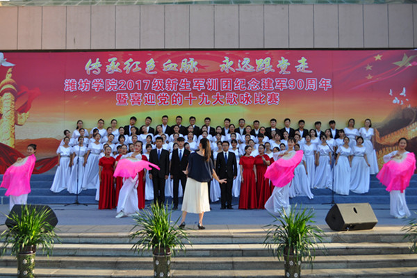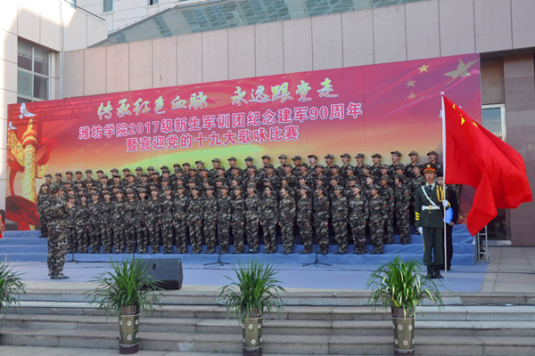本网讯 “我们迎着初升的太阳,走在崭新的道路上。我们是优秀的中华儿女,谱写时代的新篇章。我们迎着风雨向前方,万众一心挽起臂膀。我们要把亲爱的祖国,变得更加美丽富强!”铿锵的歌声震撼着心灵,一首首豪迈、雄壮、嘹亮的歌声在校园响起。为庆祝中国人民解放军建军90周年,喜迎党的十九大胜利召开,9月18日,学校举行“传承红色血脉永远跟党走”2017级学生军训团合唱比赛。