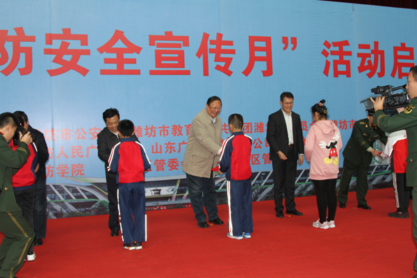 启动仪式由潍坊市人民政府副秘书长徐凤徽主持。启动仪式上表彰了全市中小学生家庭消防疏散逃生路线图绘画征集大赛活动获奖者,为“全民消防我代言”潍坊消防代言人公益宣传队佩戴绶带、为消防志愿者服务队绶带。