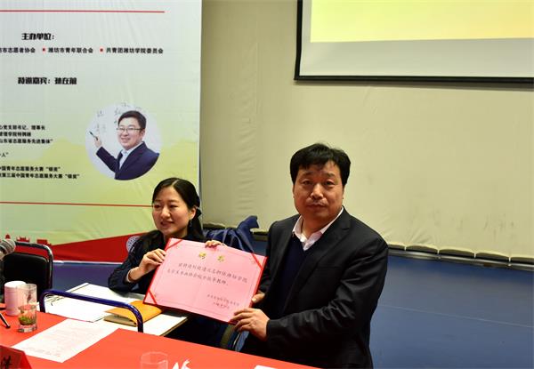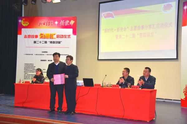 会上,团市委副书记张新明介绍了全市青年志愿服务工作,并就如何开展好“新时代·新使命”志愿故事分享汇活动提出了要求。王清明分别为孙在前、刘晓清两位嘉宾颁发了潍坊学院学生社团校外指导教师聘书。孙在前、刘晓清分别做了故事分享。