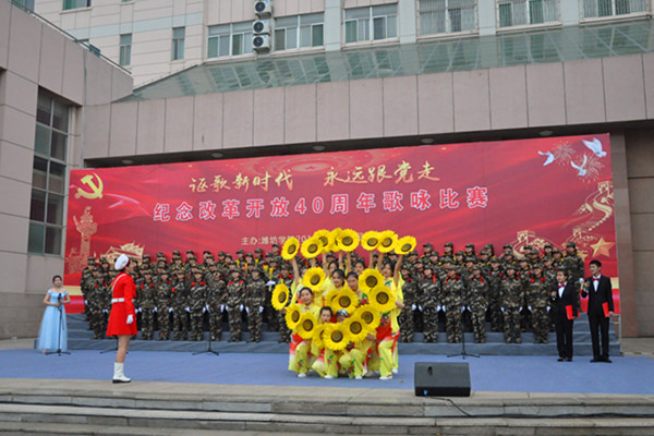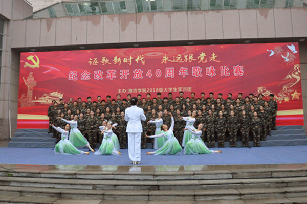 特教幼教师范学院演唱的《前进吧,中国共产党》拉开了新生军训团歌咏比赛的序幕。《复兴之路》《永远跟党走》《强军战歌》《我们走在大路上》《不忘初心》《在希望的田野上》《中国军魂》等一首首红歌,各比赛团队都加入了更多的创意,展现出了不同的风格。一首首耳熟能详的歌曲,充分展示青年学生爱党、爱国、爱军的情怀和蓬勃向上的精神风貌,唱出了潍院学子满腔的爱国热情,永远跟党走的坚定理想信念。