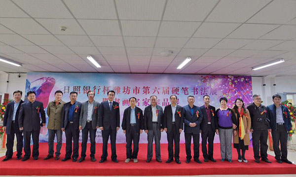本网讯 10月20日,潍坊市第六届硬笔书法展暨书画名家作品展在我校美术馆开幕。副校长丁子信出席开幕式并致辞。潍坊市文联副主席任学军,日照银行潍坊分行党委书记、行长王志刚,中国硬笔书协理事、山东工委名誉主席、潍坊市硬笔书法家协会荣誉主席、大展组委会主任高华忠,中国硬笔书协会员、山东工委副主席、潍坊市硬笔书法家协会主席齐玉华,潍坊硬笔书法家协会副主席兼秘书长、潍坊枫丹白露美术学校校长赵青,学校院教务处、美术学院负责同志参加开幕式。
