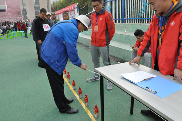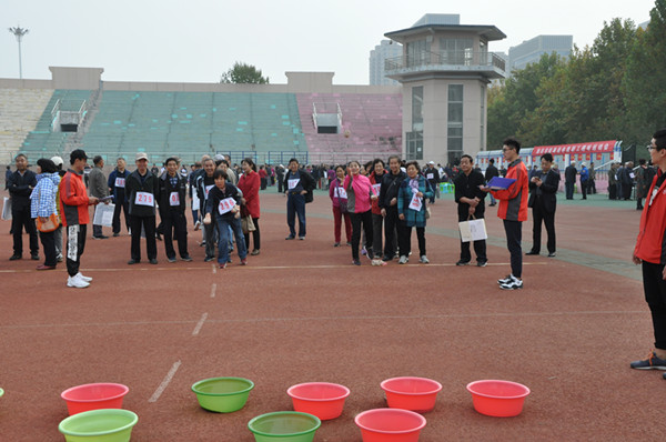 本网讯 10月25日,我校离退休教职工趣味运动会在田径运动场举行。360余名离退休老同志参加了篮球撞柱、排球保龄、夹玻璃球、投筷进瓶、套圈、投沙包等6个项目的比赛。党委副书记王清明在离退休处工作人员的陪同下观看了比赛,并和老同志们合影留念。