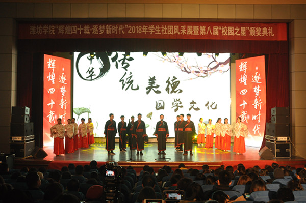 在《欢聚一堂》动听的歌声中,颁奖典礼正式拉开帷幕。相声《多亏了这条路》由大学生争鸣社选送,用幽默诙谐的话语表达的是大学生对于“一带一路”的用心关注。《诗经》经典篇目吟唱则由我校大学生诗词学会完成,近年来该社团举办的诗词大会颇有影响。充满热血与激情的大学生街舞协会,用他们自己编排的一曲《School Days In WFU 》展现潍院大学生活的一天,带观众们感受潍院学子的青春活力,展现了学生社团的酷绚风采。大学生播音与主持协会带来的诗朗诵《梦想照亮中国》,用饱含深情的语言表达着青年一代对中国共产党的歌颂,对改革开放40年的礼赞,传递着发奋学习、励志成才的强音。在学生中很有影响力的元素音乐社带来的是他们改编创作的歌曲串烧《红旗飘飘+铿锵玫瑰+中国范儿》,诠释着潍院学子的爱国之情;飞扬话剧社带来的话剧表演《改革之春》是学生们自编自导自演的短剧,用同学们的话说是“致敬改革开放40年”,学生们用发生在我们身边的改革变迁,带我们回顾了中国改革开放的点点滴滴,40年的沧桑巨变,40年的光辉历程,铸就了中华民族伟大复兴的梦想!大学生合唱团带来的混声联唱《年轻的朋友来相会》更是将展演推向高潮,20年后再相会,伟大的祖国该有多么美!激越的演唱表达着潍院学子青春奋斗、热爱祖国的浓浓深情。