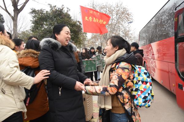 本网讯 1月11日上午,我校参加2018年下半年实习支教的455名学生圆满完成实习支教任务,顺利返校。教务处、文学院、外国语学院、数学院、体育学院相关负责同志以及辅导员老师们在行政楼北广场迎接返校学生。