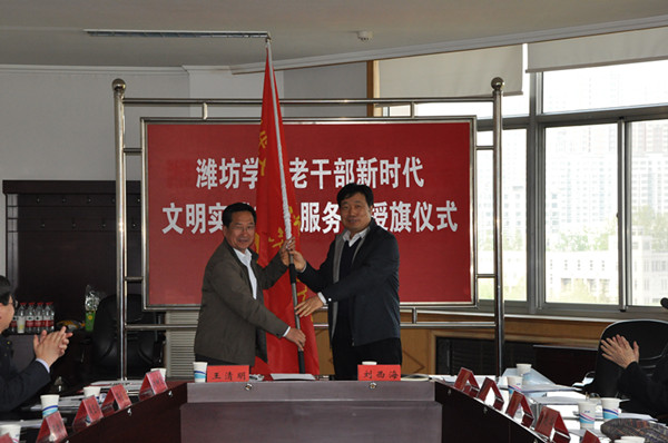 本网讯 4月16日,潍坊首支高校老干部新时代文明实践志愿服务队伍——潍坊学院老干部新时代文明实践志愿服务队在我校正式成立。这支队伍是为充分发挥老干部们政治优势、经验优势、威望优势和作用,多渠道、多方位满足老干部们的精神需求,引导老干部保持老骥伏枥、老当益壮的健康心态和进取精神,本着学养相彰、开放融合、老有所为的工作理念,激励老干部们用自己的特长服务社会、服务潍坊、服务群众。校党委副书记王清明出席成立仪式并向志愿服务队队长授旗。市委宣传部二级调研员刘西海出席仪式,离退休处相关负责同志、志愿服务队成员参加了仪式。