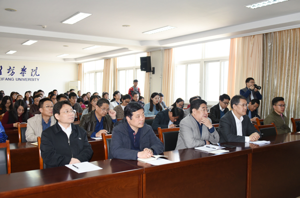聘任仪式结束后,王立胜教授为经济管理学院、马克思主义学院教师及学生代表作了题为《实施乡村振兴战略的“潍坊模式”》的学术报告。王立胜教授从“潍坊模式”形成发展的历史过程、“潍坊模式”的主要特点、“潍坊模式”的经验启示、从“潍坊模式”看实施乡村振兴战略的几个关键问题等四个方面对“潍坊模式”作了精彩的阐述。下午,王立胜一行还与乡村振兴潍坊模式研究院(筹)相关人员就研究院建设规划方案进行了论证,并就下一步研究的方向,如何开展研究等问题进行了交流。