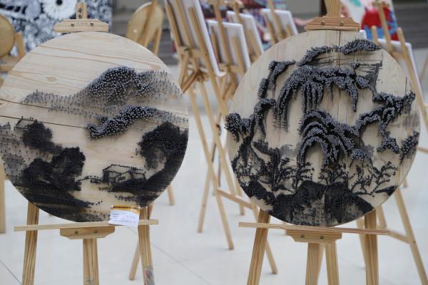 本网讯 4月23日,学校图书馆一楼中厅。这里摆放的一系列手工展品,吸引了众多师生驻足观赏。这是我校美术学院在全校范围举办的校园美育系列活动之一“手工篇”,展示了美术学院环境设计专业学生在《壁画与纤维艺术》和《空间概念设计》课程上的作业。同学们寻觅身边可以使用的各种材料,或编织,或雕刻,或绘制,通过综合手法达到对于美的形式感知与情感抒发。