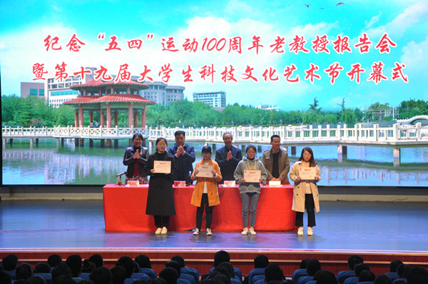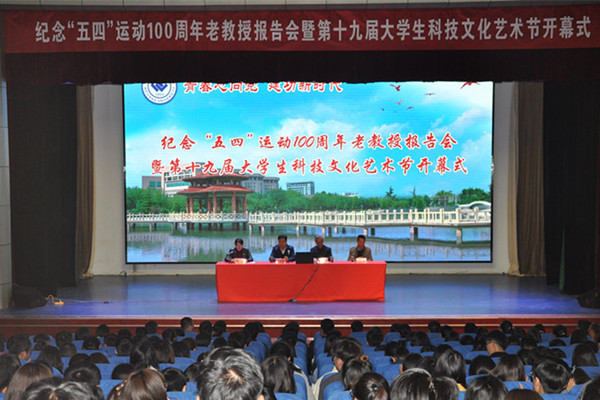 本网讯 4月25日下午,我校纪念“五四”运动100周年老教授报告会暨第十九届大学生科技文化艺术节开幕式在学校图书馆报告厅举行。学校党委副书记王清明出席。离退休工作处、团委相关负责同志和各学院团总支书记、学生代表近500人参加了活动。我校播音与主持专业退休教授周国柱做专题报告。