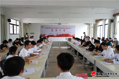 中国教育在线讯 6月13日下午,中共潍坊学院美术学院学生支部委员会换届选举党员大会暨全校基层党组织换届选举现场观摩会在美术学院分党校召开,学生党支部委员、团总支书记江浩浩主持,学院党总支委员、组织员、教工支部委员、学生支部全体师生党员及部分入党积极分子参加,学校党委组织部正处级组织员郭建伟、正科级组织员刘效磊和二级学院学生党支部书记现场观摩指导。