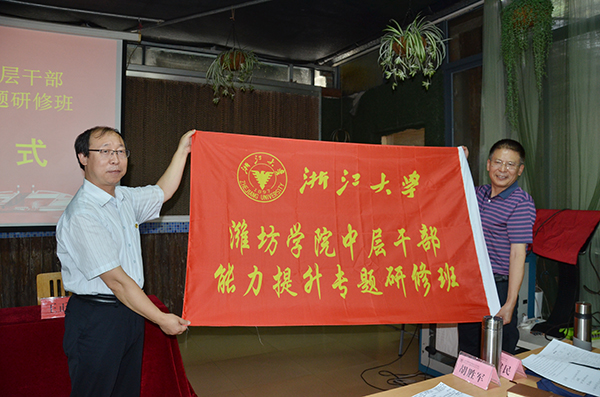 本网讯 7月18日上午,我校暑期领导干部综合能力提升研修班在浙江大学华家池校区正式开班。党委副书记、校长冯滨鲁,浙江大学继续教育学院副院长王正栋在开班仪式上致辞。王正栋向学员代表授班旗。副校长朱猷武、王旭升出席开班仪式。学校行政部门负责人和各学院院长及相关同志40余人参加了活动。