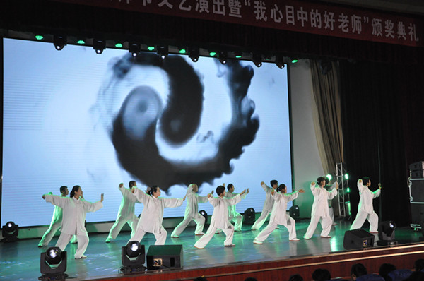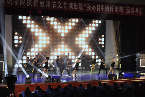 晚会在歌伴舞《美丽中国走起来》拉开了序幕,我校师生对祖国70华诞的热切期盼立时展现在观众面前,澎湃在所有人心头。诗朗诵《师说》的表演者,是我校近年来在山东省青年教师讲课大赛中获得一等奖的老师们,她们娓娓道来的诉说,把对教育的执着和对学生的热爱淋漓尽致的表达出来,深深感染着在场的每一位观众。由我校教师带来的太极拳表演,招招式式扣人心弦,既诠释出“太极之美”,也传承了优秀传统文化瑰宝。晚会上,大学生们也用自己精挑细选的节目编排,表达着对最可爱的老师们的礼赞与祝福:歌曲《老师您好》、器乐联奏《桃李报春》刻画出同学们内心深处对老师浓浓的敬佩与感恩,寄上学子们最诚挚的祝福。诗朗诵《走向属于您的明天》,歌伴舞《领航新时代》更是将晚会推上高潮,昨天的祖国奋斗不息,今天的祖国和谐美丽,明日的祖国未来可期!潍院学子用激情飞扬的艺术表演诠释自己的赤子之心。同学们将青春的火热与奋斗的激情融入在歌曲《时间的远方》、《最美的太阳》与萨克斯重奏《放飞梦想》之中,当莘莘学子从老师的手中接过接力棒,他们的青春在老师的注视下开始闪光。