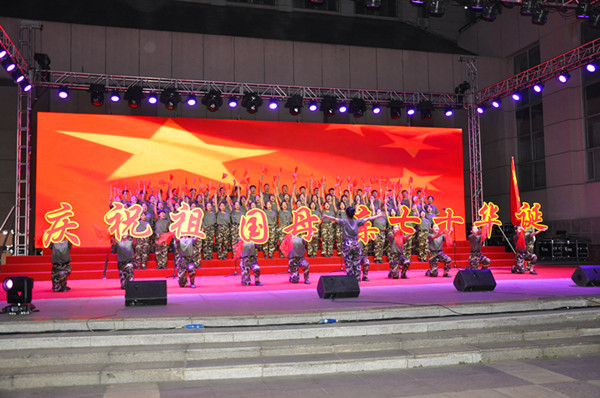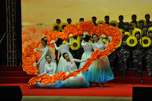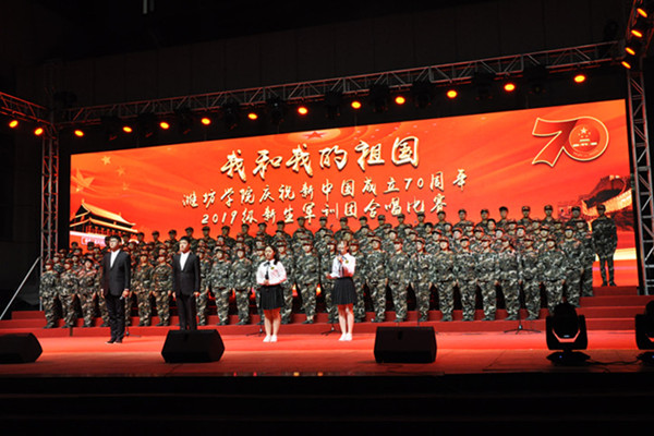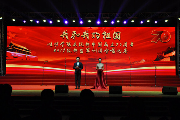 美术学院演唱的《祖国颂》拉开了合唱比赛的序幕。《歌唱祖国》《红旗飘飘》《向往》《我爱你中国》《中国军魂》《祖国不会忘记》《爱我中华》《强国一代有我在》《不忘初心》《走向复兴》等一首首歌唱伟大祖国和党的动人旋律,响彻在潍院的上空。各比赛团队都加入了朗诵、舞蹈等创意,展现出了不同的风格。一首首耳熟能详的歌曲,充分展示青年学生爱党、爱国、爱军的情怀和蓬勃向上的精神风貌,唱出了潍院学子永远跟党走的豪迈之情以及为新中国70周年庆生的欢乐心情。新生合唱比赛是历年军训的保留项目,今年在舞美方面又作了提升,增加了大屏幕背景和灯光,使整个舞台绚丽多彩美轮美奂。