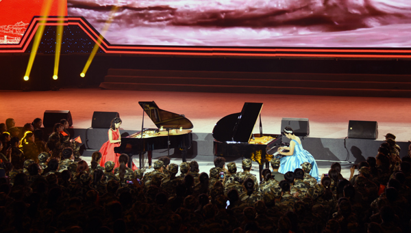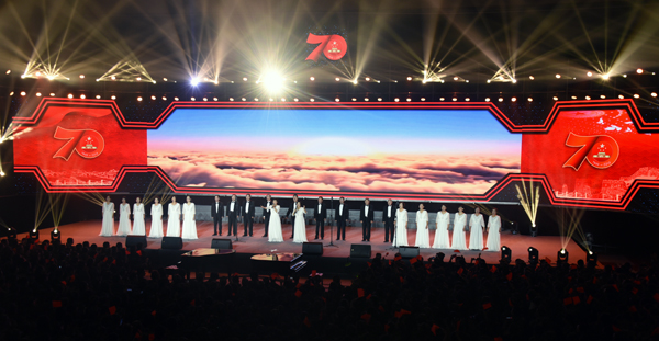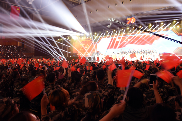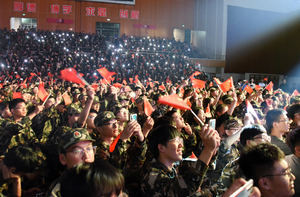 本网讯 9月27日晚,在庆祝新中国成立70周年,开展“不忘初心、牢记使命”主题教育之际,我校庆祝新中国成立70周年文艺晚会在学校体育馆举行。学校领导孙文亮、冯滨鲁、王清明、丁子信、马茜华、朱猷武、赵光强、王旭升,市委教育工委副书记、市教育局二级调研员李广敬与6000余名师生及军训团官兵一起观看晚会,共同回顾70年来新中国的建设成就,祝愿伟大的祖国繁荣昌盛。