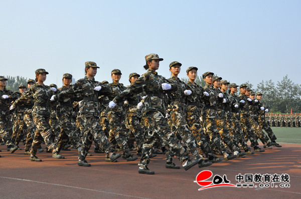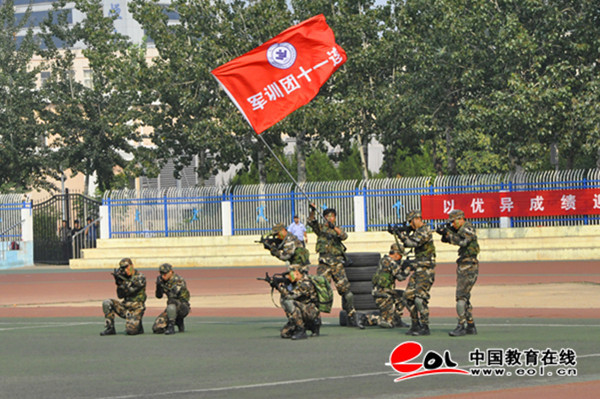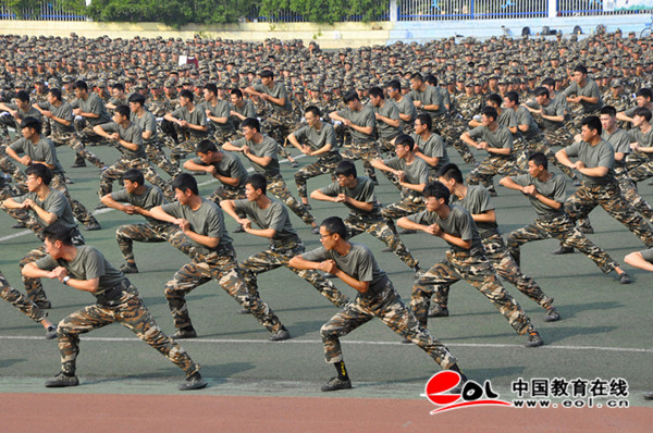 庄严的升国旗仪式后,2019级新生军训方队迈着整齐的步伐,喊着嘹亮的口号,斗志昂扬的从主席台走过,接受与会领导的检阅。之后,他们进行了正规化动作、军体拳、战术与战地救护等表演。