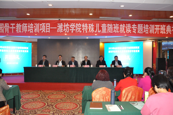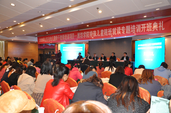 本网讯 10月15日,我校举行2019年山东省幼儿园骨干教师特殊儿童随班就读专题培训班开班典礼。副校长丁子信出席开班仪式并致辞。教务处和特教幼教师范学院负责人及全体培训学员参加了典礼。