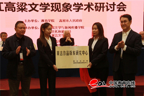 会上,赵光强、程光炜为新成立的“莫言作品版本研究中心”揭牌。赵光强为首批被聘任的莫言研究“风筝学者”“红高粱学者”“创意写作导师”“创意艺术家”等学者、作家、艺术家代表颁发了聘书。创意艺术家、高密红高粱抗战纪念馆馆长、著名画家刘铁飞先生向莫言研究中心捐赠画作《魔幻红高粱》,由中心主任王万顺博士接受捐赠并颁发收藏证书。