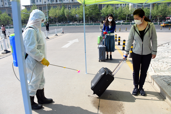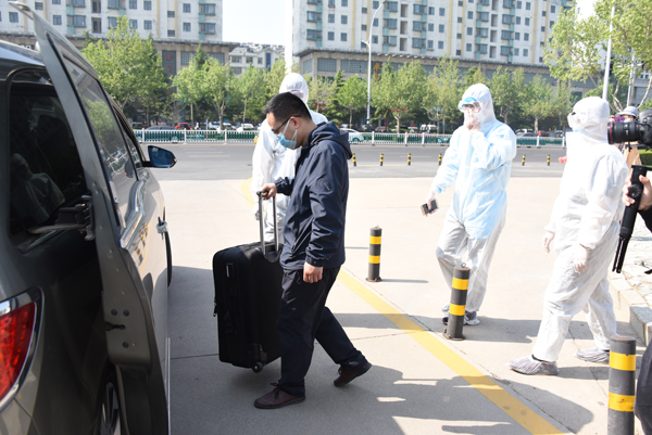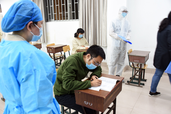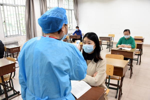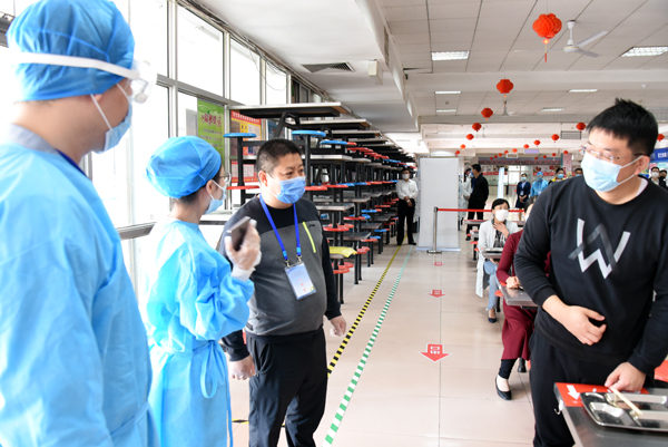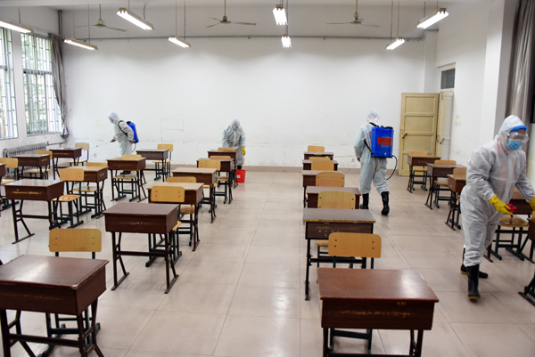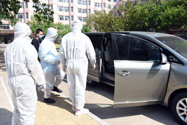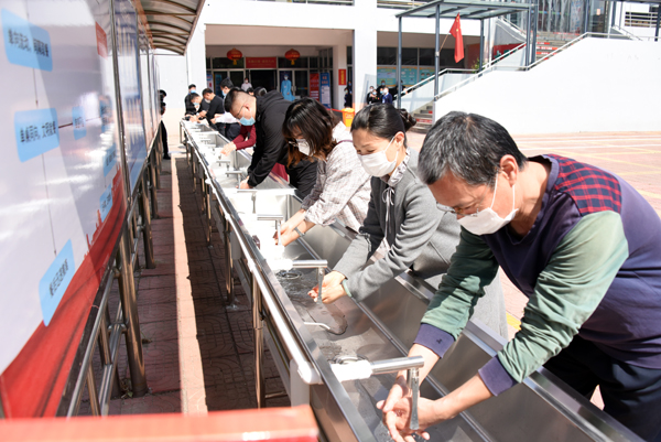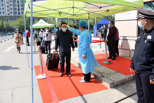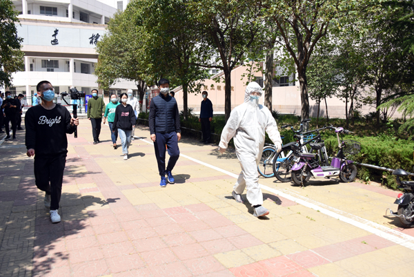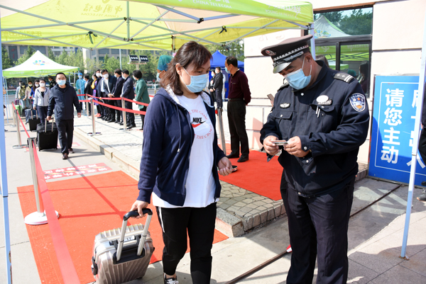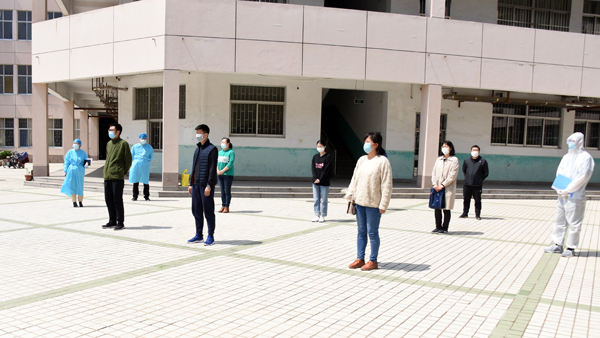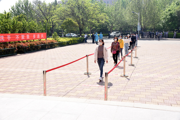 在学校南大门返校报到入口处,学生戴口罩间隔2米排队入校,依次经过行李消毒、检测体温、身份验证进入校园。设立的体温检测双通道、临时留观点,既保证了入校秩序,又确保了师生健康安全。本环节着重演练了体温异常学生返校的应急处置程序。
