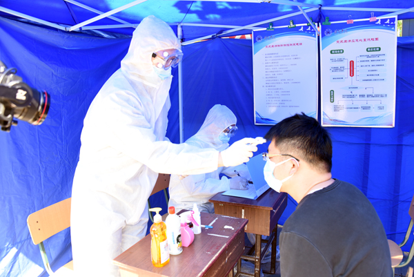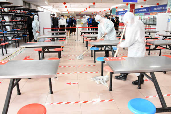 在宿舍楼前,学生相隔2米排队进入宿舍楼,依次模拟演练了体温测量、宿舍内学生体温自测异常的应急处置。该环节还对经定点医院发热门诊诊断,排除疑似或确诊新冠肺炎的发热学生,回校入住发热观察区休息治疗进行了周密安排。