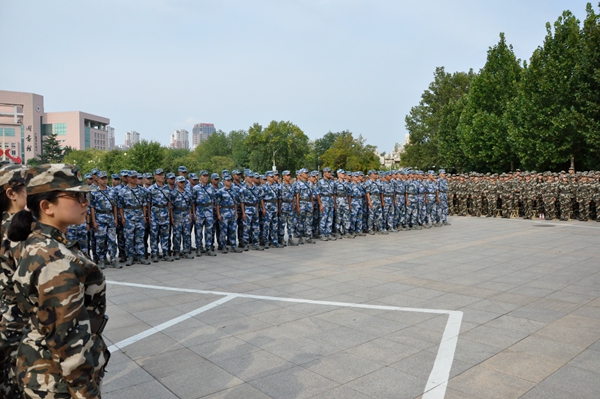 据了解,今年我校新生中参加军训的学生近6000人,训练主要内容包括:中国人民解放军优良传统教育、队列训练、内务整理、安全教育、防灾演习等。