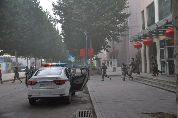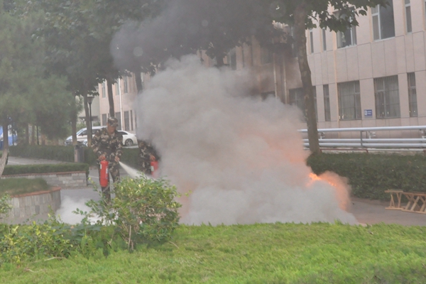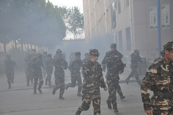 16时30分,各项工作准备就绪,王清明宣布演习开始。十一号、十二号公寓楼内外顿时浓烟滚滚,应急疏散警报开启,新生开始应急疏散。接到报警后,“校园110”到达现场进行灭火救援并协助新生疏散。随后,新生进行了灭火实战技能汇报演出。