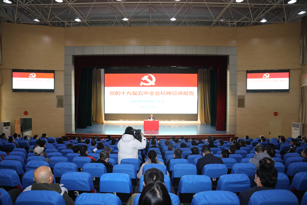 本网讯 11月25日,学校举行党的十九届五中全会精神宣讲报告会,学校党委书记李东作宣讲报告。校领导冯滨鲁、王清明、丁子信出席报告会。