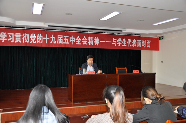 报告会上, 王清明以党的十九届五中全会《建议》的学习作为主要授课内容,围绕《建议》的重要意义和主要内容;对新发展阶段、新发展理念、新发展格局的分析;坚持党的全面领导,动员各部分力量为实现“十四五”规划和实现二〇三五年远景目标共同奋斗三个方面深入解读了十九届五中全会精神。王清明用最“接地气”的语言,通过大量鲜活实例和数据,帮助学生们了解我国十三五期间所取得的巨大成就,对《建议》中与青年学生密切相关的内容进行了重点讲解,并对青年学生提出要求,希望广大青年学生要以实际行动学习贯彻党的十九届五中全会精神,提高政治站位,把全会精神作为成长最重要的行动指南。