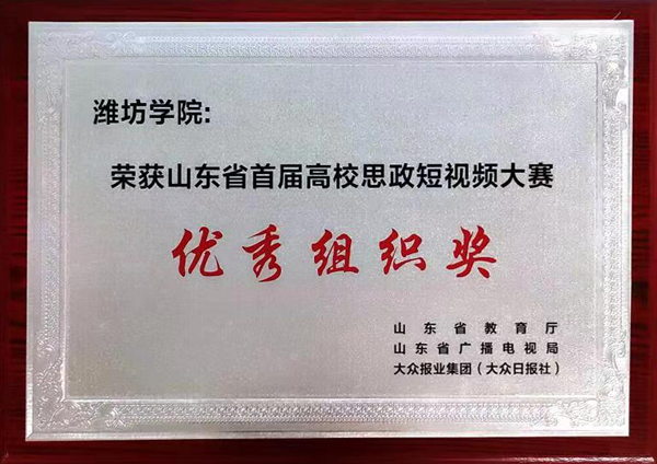 本网讯 由省教育厅、省广播电视局主办,大众日报社承办的山东省首届高校思政课短视频大赛圆满结束。本次大赛吸引了来自全省127所院校的8376部作品参赛。学校由马克思主义学院具体组织参赛。经过初审,共有500余部作品进入大众日报平台进行展示,其中我校在初审后上线作品34部,经过网络投票和专家评审,潍坊学院荣获本次比赛优秀组织奖,5部师生作品获奖。