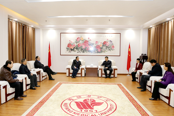 本网讯 1月21日,我校党委书记李东、校长冯滨鲁一行4人到潍坊医学院访问交流。潍坊医学院党委书记李明、校长管英俊会见了李东一行。