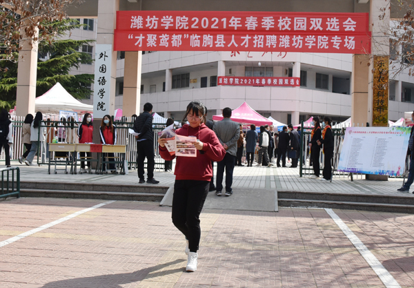 4月11日,“潍坊学院2021年春季校园双选会·‘才聚鸢都’临朐县人才招聘潍坊学院专场”在至善楼举行。44家用人单位及我校近千名应届毕业生参加了本次招聘会。招聘会上,临朐县人社局局党组书记、局长傅士建,就临朐县经济社会发展和人才优惠政策进行了宣传推介。本次招聘提供了就业岗位1590个,涉及化工、电子、外贸、食品、酿酒、环保、新能源等多个行业。毕业生初步达成就业意向280余人次。