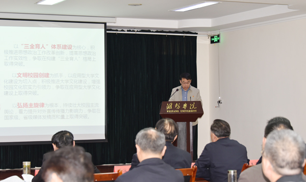 就落实上级精神、抓好目标任务落实,李东指出,要把握形势要求,落实立德树人根本任务。要全面提升人才培养能力,构建完善德、智、体、美、劳“五位一体”育人体系,努力培养社会急需的高素质应用型人才。要优化学科专业体系,推进新工科、新农科、新文科建设,促进学科交叉融合,加快推进硕士学位授予立项单位建设,提升科技创新能力特别是应用研究能力,加强产学研深度融合,促进科技成果转化。要深入实施服务地方行动,发挥学校人才科技优势,全方位深化校地合作、校企合作,全面提升服务地方能力水平。要坚定文化自信,打造地方文化高地,积极承担地方文化传承创新重大工程,传承弘扬地方优秀传统文化,带动示范提升城市文化品质。要坚持开放办学,吸收借鉴国(境)外教育成功经验,搭建中外友好交往合作平台,讲好中国故事,提升学校国际化办学水平,增强国家文化软实力。
