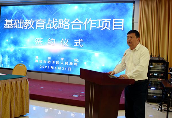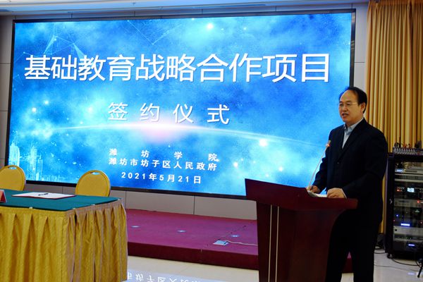 本网讯 5月21日上午,潍坊学院与坊子区基础教育战略合作签约仪式举行,双方就构建“U-G-S”(大学-政府-中小学校)合作模式,促进高等教育与基础教育“教、学、研、训”一体化和坊子区现代化教育强区建设,助力现代化高品质城市建设达成一致意见。协议中包括依托新建的坊子区博文现代学校建设潍坊学院附属实验学校,校地共同建设区域教师发展研究基地,共建区域基础教育研究与评价协同创新中心,共同引进高层次人才,携手开展乡村教育振兴行动等。